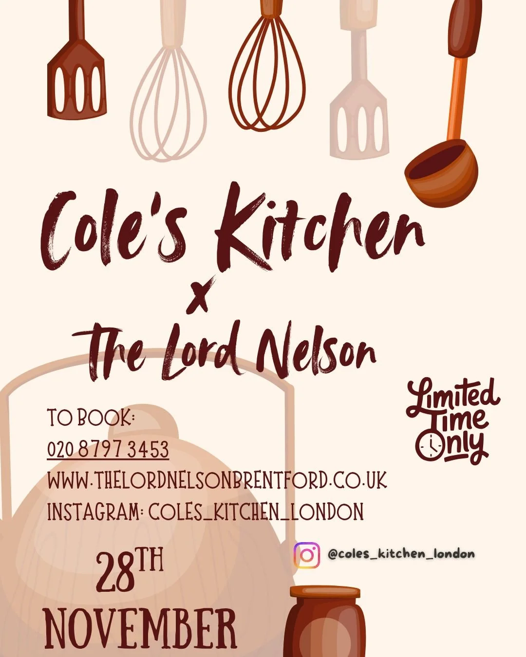 Delighted to have Cole’s Kitchen back for another pop-up full of delcious food & great vibes. Adam’s been a busy boy since we last had him here, getting rave reviews for his food at pop-ups and residencies all over London so you aren’t going to want to miss this. Tables will go fast so grab some friends & book soon. You can see the menu on our social pages.